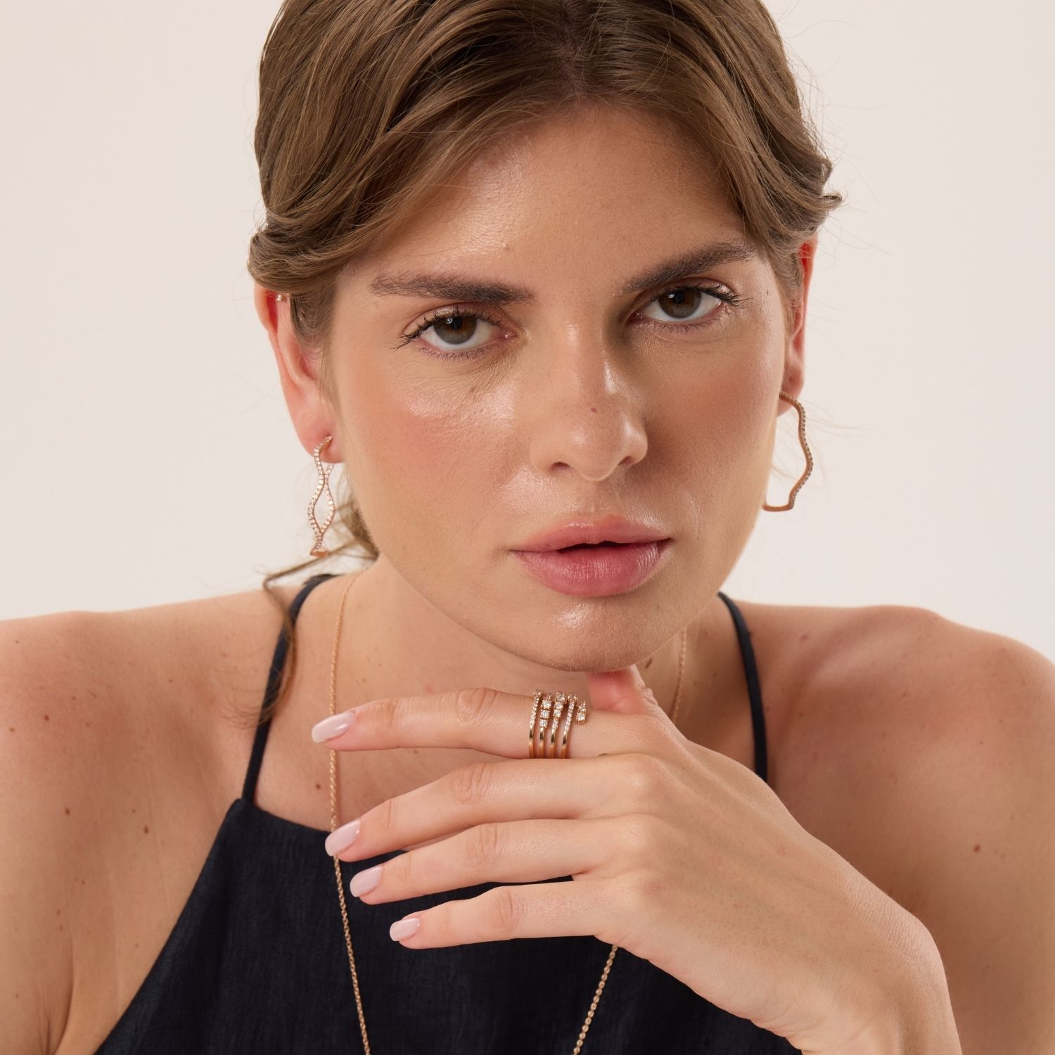 “Cassandra Earrings” appear to have a stylish, attention-grabbing, and original design, making them a potential new classic. The use of rose gold and diamonds adds a luxurious and elegant touch, while the design that seems to pass through the ear creates a very modern and bold style. The Cassandra Earrings will help you create a striking look.